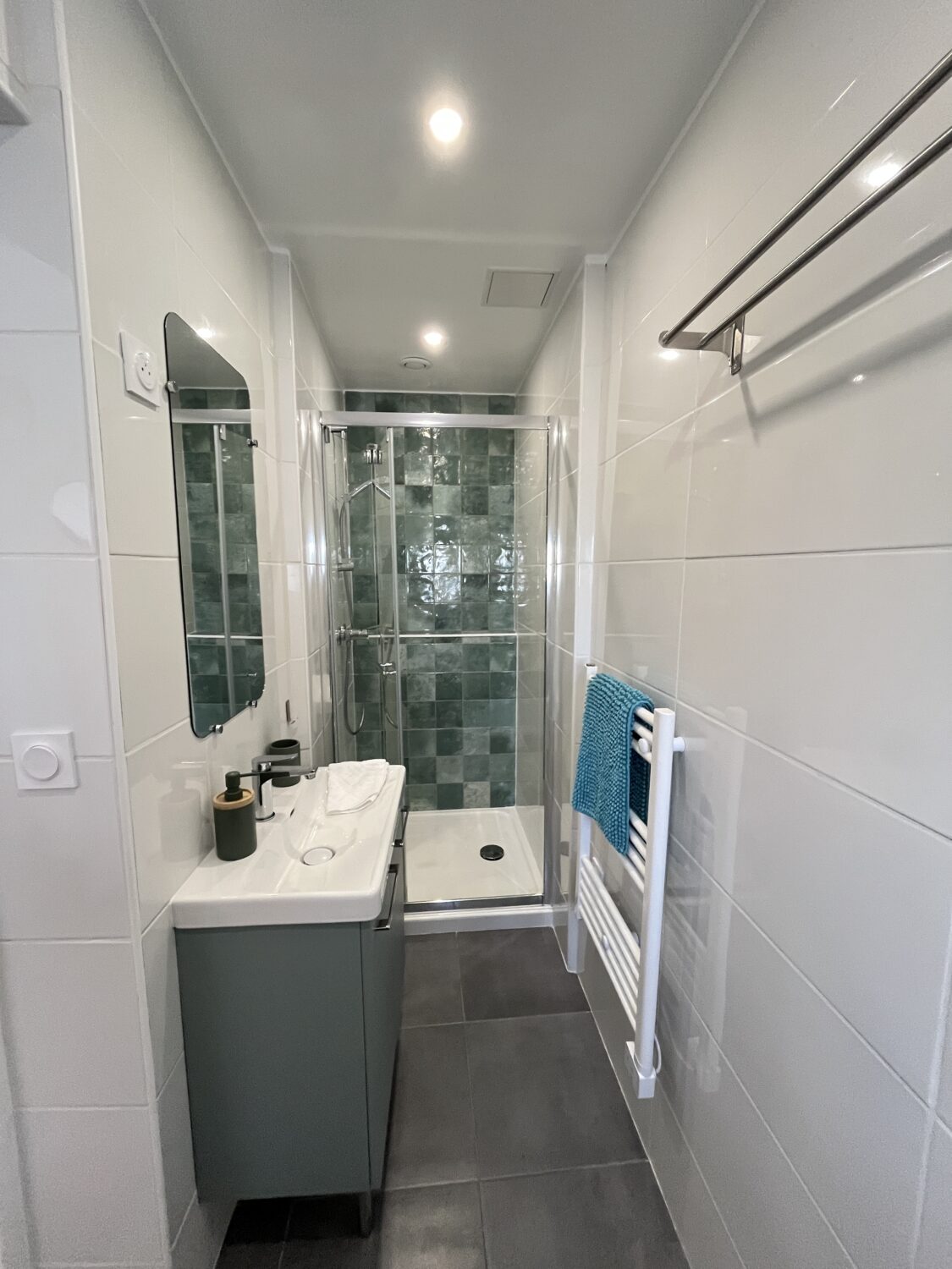 - Au rez-de-chaussée : séjour avec canapé convertible pour 2 personnes et sa cuisine ouverte équipée ainsi qu’une salle d’eau avec douche et WC.